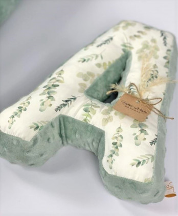 Παιδικό διακοσμητικό μαξιλάρι μονόγραμμα με σχέδιο φύλλα ευκαλύπτου για το παιδικό δωμάτιο. Εξολοκλήρου χειροποίητο προϊόν κατασκευασμένο από 100% βαμβακερό ύφασμα.