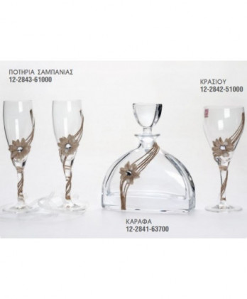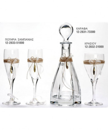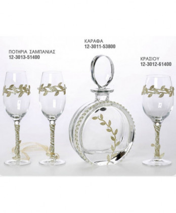 Πλήρες σετ γάμου αποτελείται απο ποτήρι κρασιού και σαμπάνιας, καράφα και δίσκος, στολισμένο από σπάγγο και σχέδιο φύλλο σε χρυσό χρώμα.
