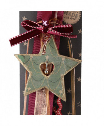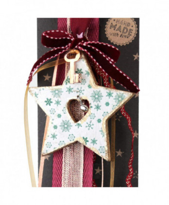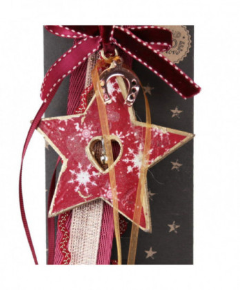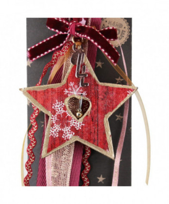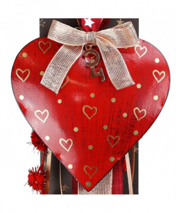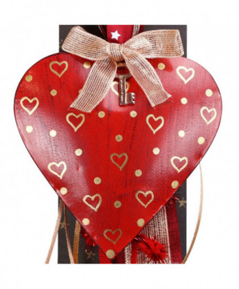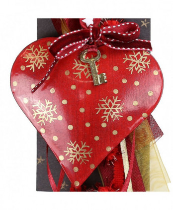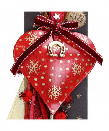 Χειροποίητο γούρι με μεταλλική καρδιά σε βαθύ κόκκινο, ζωγραφισμένες χρυσές νιφάδες και μεταλλικό στοιχείο πέταλο. Θα το παραλάβετε πάνω στο καρτολίνο του και μέσα στο φανταστικό μας κουτί από οικολογικό χαρτί.