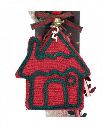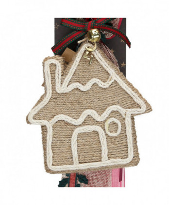 Χειροποίητο γούρι με ένα σπίτι από ξύλο τυλιγμένο με κόκκινο σκοινί γιούτας. Συνδυάζεται με μεταλλικά στοιχεία, κουδούνια και πανέμορφες κορδέλες σε κόκκινο και χρυσό που προσθέτουν λάμψη και πολυτέλεια.