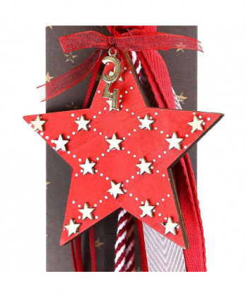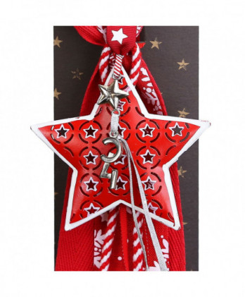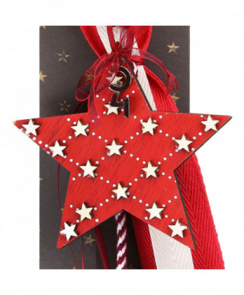 Χειροποίητο γούρι με ξύλινο κόκκινο αστέρι και μικρά κρεμ αστεράκια σε γεωμετρικό σχέδιο στην επιφάνια του. Μοναδικές κορδέλες και κορδόνια εξαιρετικής ποιότητας ολοκληρώνουν αυτό το όμορφο γούρι.