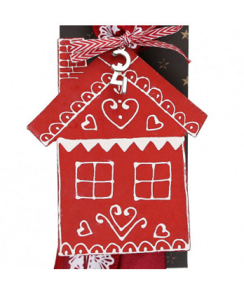 Γούρι με ένα ξύλινο κόκκινο σπίτι, από ξύλο μάνγκο ζωγραφισμένο στο χέρι με περίτεχνα σχέδια με λεπτό πινελάκι. Συνδυάσαμε υπέροχες κορδέλες σε αποχρώσεις του κόκκινου και μεταλλικά στοιχεία για τον συμβολισμό.