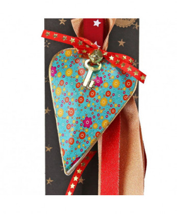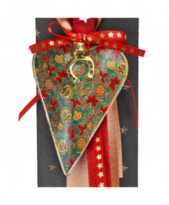 Χειροποίητο γούρι με μια μεταλλική καρδιά τυρκουάζ, διπλής όψης με φλοράλ σχέδια και χρυσό αντικέ τελείωμα. Μοναδικές κορδέλες και κορδόνια εξαιρετικής ποιότητας ολοκληρώνουν αυτό το όμορφο γούρι.