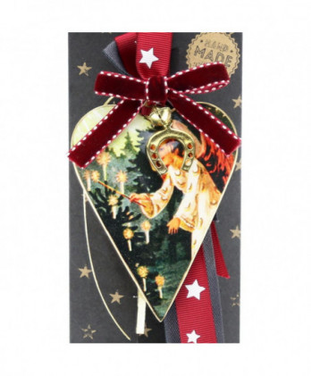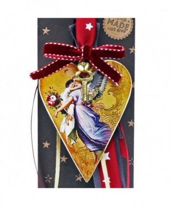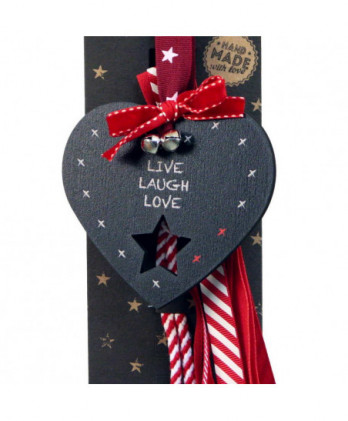 Στιλάτο χειροποίητο γούρι με ένα ξύλινη καρδιά με εφέ μαυροπίνακα. Οι κόκκινες κορδέλες και τα κορδόνια κάνουν ένα έντονο κοντράστ με εντυπωσιακό αποτέλεσμα.