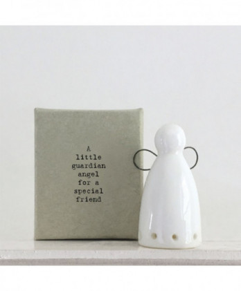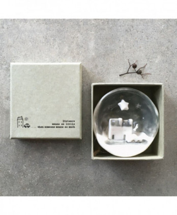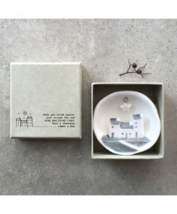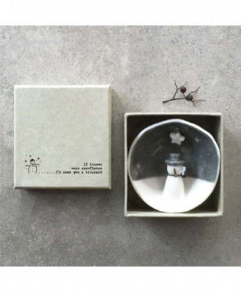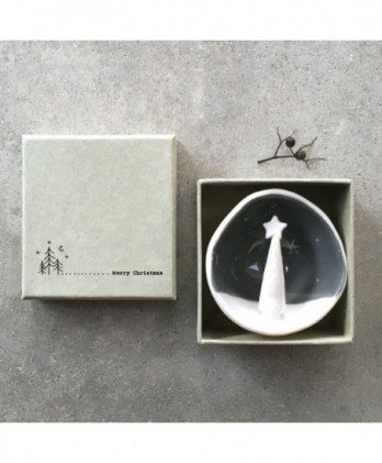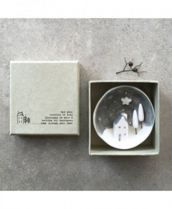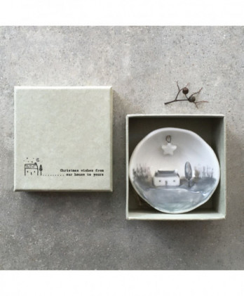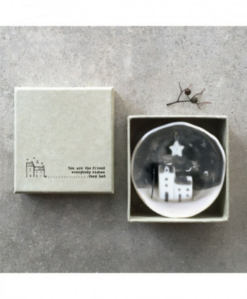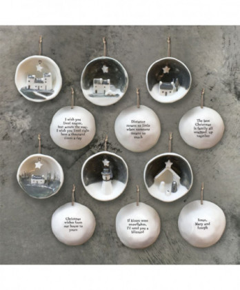Υπέροχο χειροποίητο κρεμαστό στολίδι από λευκή πορσελάνη. Μισή σφαίρα με ένα εγχάρακτο μήνυμα Merry Christmas, στην εξωτερική της πλευρά και μια μινιατούρα στην εσωτερική πλευρά. Έρχεται σε ένα αντίστοιχης αισθητικής κουτί δώρου.